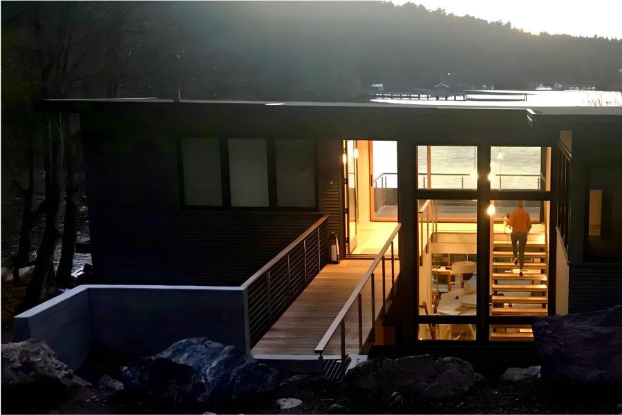 A steel framed bridge spans a ravine to access the entry door. The 2nd floor foyer and adjacent roof deck frame a dramatic panorama of the bay. A centrally located open stairway descends to the great room below. Large sliding doors open up the rooms to the low bank waterfront.